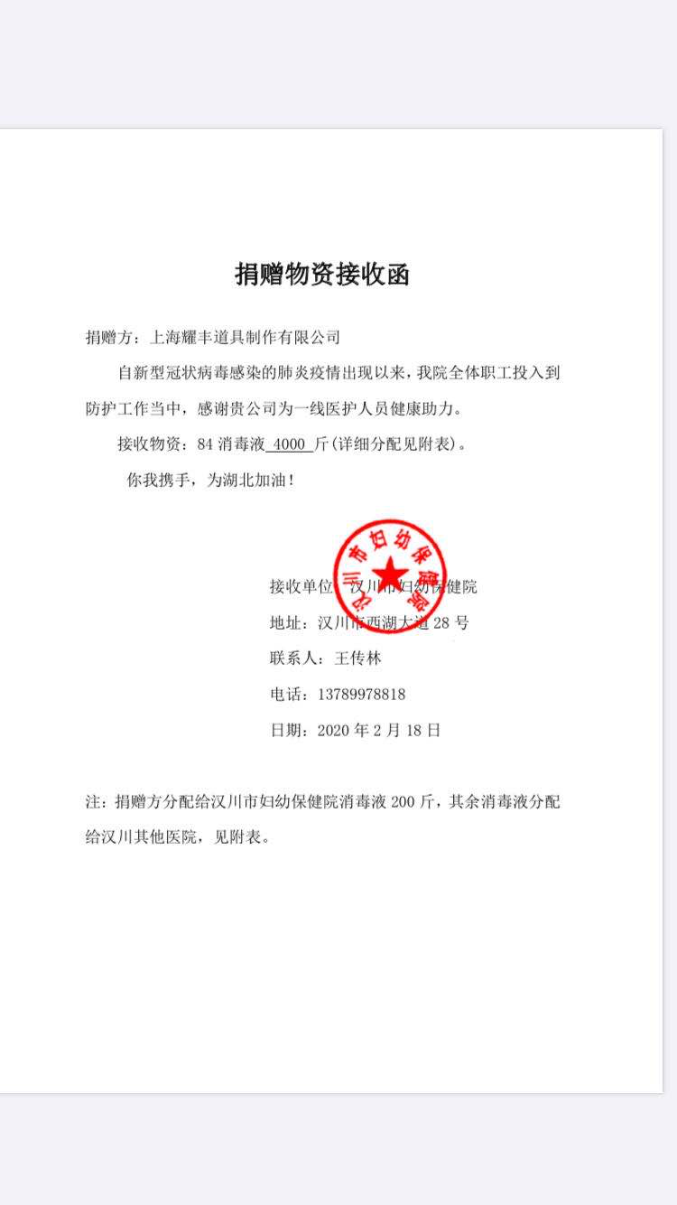 突如其来的新型冠状病毒感染的肺炎疫情牵动着社会各界的心,抗击疫情已成为每个人义不容辞的责任,耀丰国际也全力以赴投入到这场战役中。公司决定向青浦市红十字会捐款人民币2万元,用于抗击疫情。并向汉川市妇幼保健院捐赠消毒液4000斤。